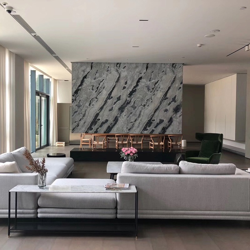 A:Этот сине-серый кварцит, передающий атмосферу бушующего моря, отличается элегантными, плавными прожилками, создавая современный и роскошный образ.
