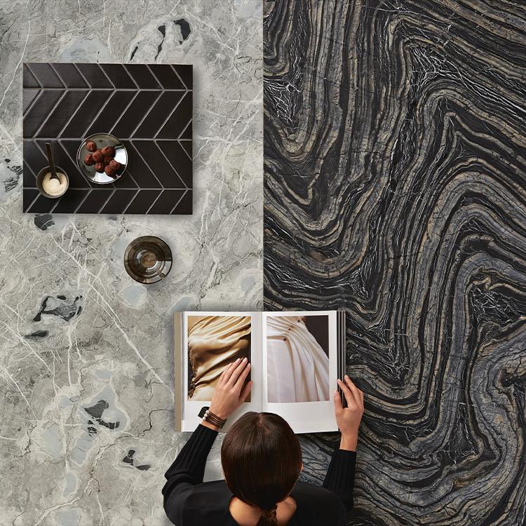 В основе этого цвета лежит насыщенный, глубокий черный или угольно-черный оттенок. Это не матовый черный, а богатый, насыщенный цвет с бархатистым, роскошным темным фоном, который поглощает свет, создавая ощущение глубокой глубины и изысканности. Эта глубокая основа делает его первоклассным выбором для создания эффектных темных столешниц и элегантных, атмосферных интерьеров.