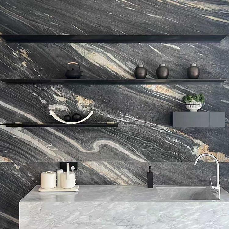 Кварцит Намко — Откройте для себя кварцит Namco — роскошную плиту из черного кварцита с плавными прожилками, имитирующими чернильную размывку, золотисто-янтарными акцентами и оттенками синего. Идеально подходит для роскошных кухонных столешниц, туалетных столиков в ванных комнатах и акцентных стен. Оцените его прочность, уникальный дизайн и варианты применения.
